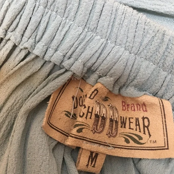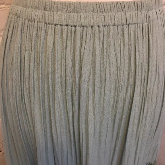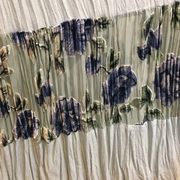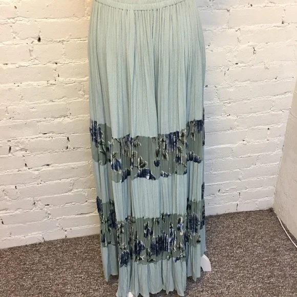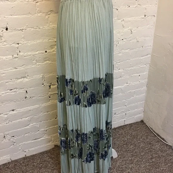crinkled light green rayonvelvet floral burnout panels at knee and bottomis unlinedelastic waist bandmeasures flat 13"-17" waist, open hip, 39" longin excellent condition with very light wear and no issueswe combine shipping. add to your cart before checkoutfor best fit compare the measurements to your clothingemail us with any questions or concernssmoke and pet free. thank you for stopping